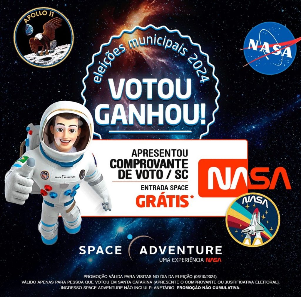 Neste domingo (06/10), os eleitores de Santa Catarina podem garantir um ingresso GRĂTIS para o Space Adventure, a famosa atração com experiĂȘncia oficial da NASA, em BalneĂĄrio CamboriĂș! Basta apresentar o comprovante de votação ou justificativa nas bilheterias e embarcar nessa viagem espacial. Mas sĂł no domingo, entĂŁo Ă© melhor nĂŁo vacilar!